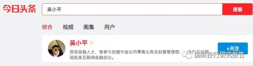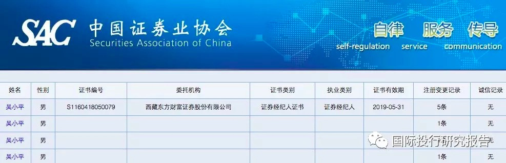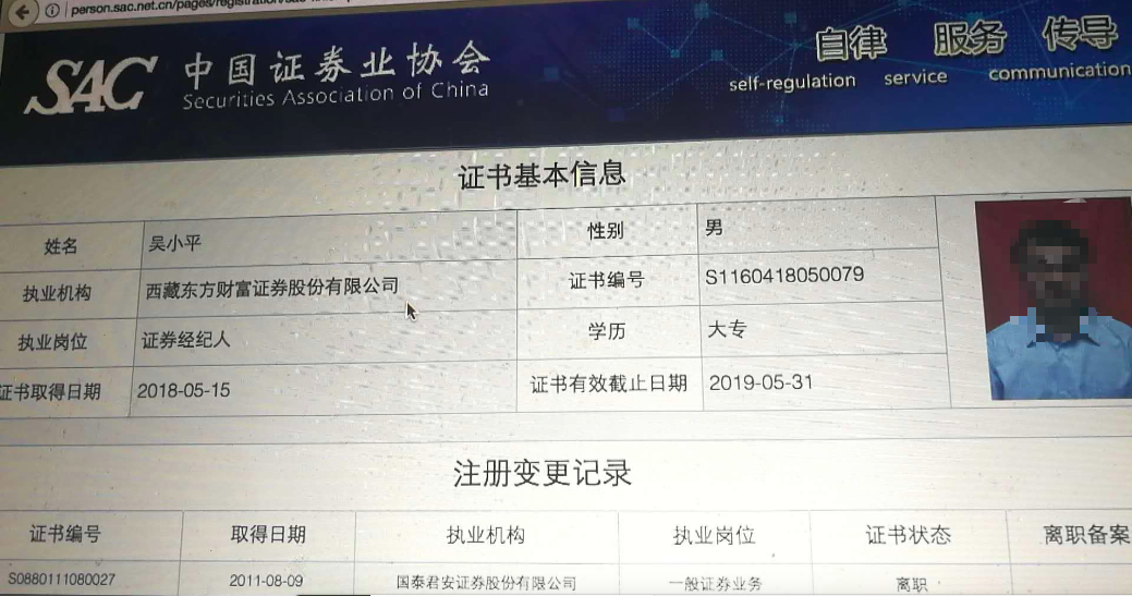 中国证券业协会信息查询显示,确有名为吴小平持有证券从业资格,但是,经查询结果显示的照片、学历等信息,说明今日头条的大V吴小平不是中国证券业协会信息显示的吴小平。