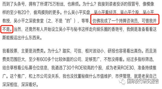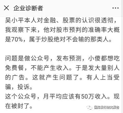 同时,正如上文的图片显示,今日头条的大V吴小平在个人的发文中曾明确表示,“仿佛我成了一个持牌咨询员,可惜我并不是”。