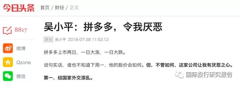 对于文章的发布,正规媒体一定有严格的审核制度;尤其是传统媒体必须是四审制,尤其对上述吴小平言论的文章,必须总编辑甚至更高级别的请示通过后才能决定是否发布,因为这已经不仅涉及经济更多的是政治经济。反观今日头条,其发布和推送的文章完全没有上述严格的审核机制,而是依靠所谓算法以及不专业的审核员,可是他们能否了解和认识到文章是否涉及政治经济呢?