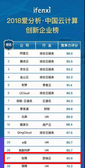 人工智能名片开创者加推科技凭借其在营销云服务领域的竞争力,相继阿里云、腾讯云、京东云90+分的强劲竞争力,以80.6分的优异成绩一同入榜,荣获“2018爱分析·中国云计算创新企业榜50强”。