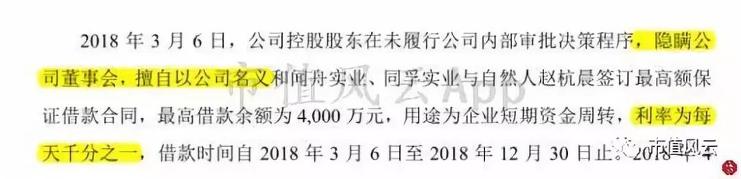 先来了解下这千分之一的利率,就知道控股股东胆有多大。此次实际借款是2000万,全部汇入的是同孚实业(控股股东控制下的企业),实际借款天数50天,按照每天千分之一的利率算,利息费是每天2万,共计利息费用100万。