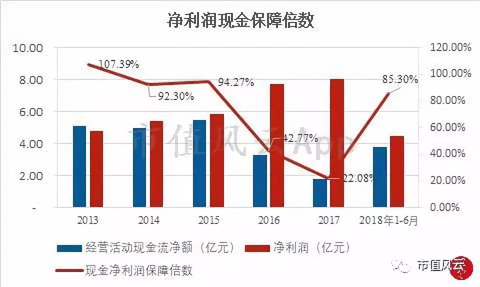 从上图看,公司2013年-2015年经营活动现金流量净额与净利润的比保持在1倍左右的水平,也就是说,公司的收益都是有实际经营现金流支持的。但2016年-2017年净利润现金保障倍数下降,从2016年42.77%下降至2017年22.08%,直到2018年上半年才上升至85.30%。自2016年开始,公司应收账款出现较快增长,存货采购支出增幅较快,周转效率有所下降。