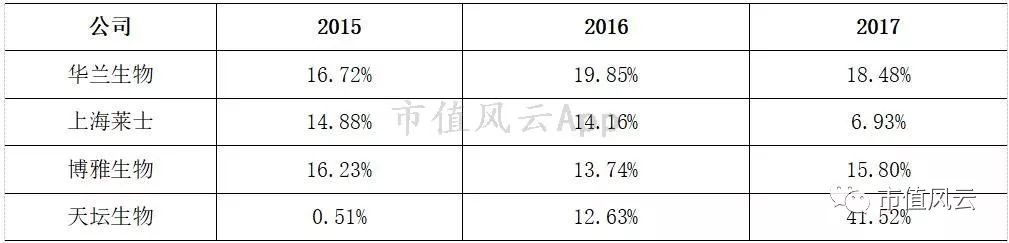 同行中,上海莱士从2016年的70.95%下降至2017年的43.16%(有较大的投资收益),天坛生物从2016年的14.46%上升至2017年的70.59%(报告期内剥离疫苗业务,出售子公司获得7.82亿投资收益),博雅生物则从2016年的29.32%下降至2017年的的24.99%(主营相对多元,存在医药经销业务)。