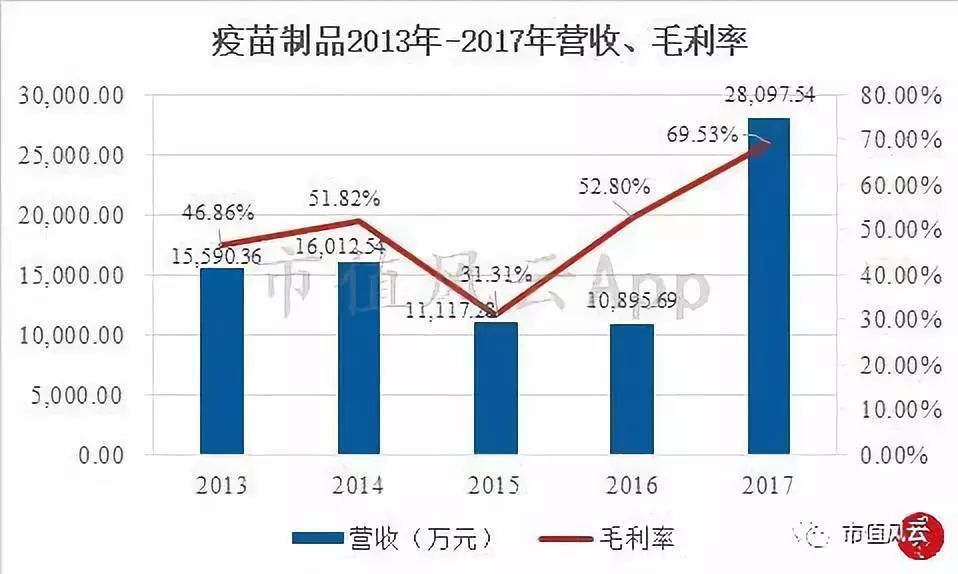 在营收及其增长方面,分年度看,近5年来公司疫苗制品营收先抑后扬,从2013年的15,590.36万元增长至2017年的28,097.54万元,年复合增长率为15.87%。