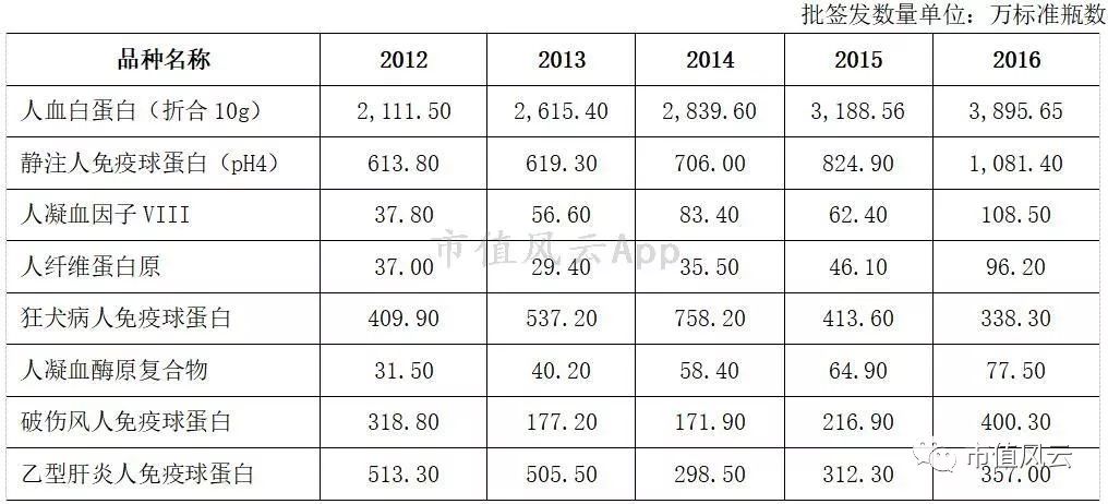 中国主要血液制品批签发数量(2012-2016年)