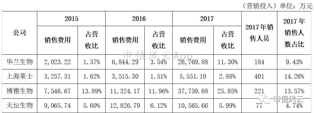 相较于研发投入,公司的营销费用投入更大。2017年,公司投入营销费用高达26,769.88万元,同比增长291.13%,其增长幅度及占营收比都大大超出公司的主要竞争对手上海莱士。