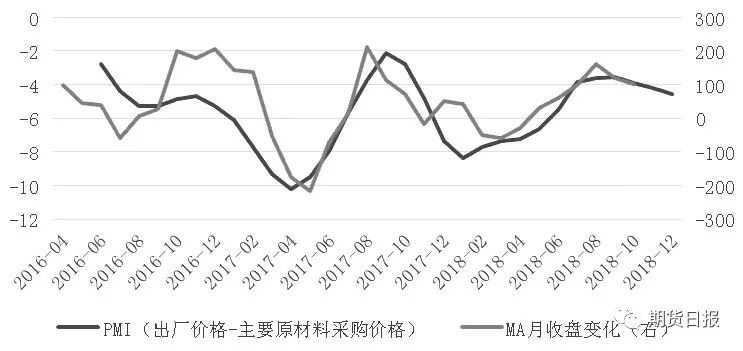 甲醇作为重要的基础化工原料,上下游市场化程度非常高,且下游产品分散,需求与价格变动与宏观经济走势息息相关。一般来讲,大宗商品价格滞后于宏观经济数据3到6个月,通过将数据进行移动平均来过滤毛刺,并经过周期匹配,可以发现:PMI(出厂价格-主要原材料采购价格)季均值的变化领先于郑醇指数月收盘价涨跌季均值3个月,趋势吻合度极高,从下图可以看出,四季度郑醇指数月收盘价的涨跌趋于收敛。