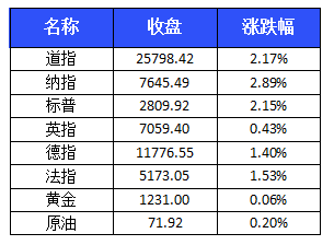 美东时间周二,美国三大股指集体上涨。截至收盘,标普500指数上涨59.13点,涨幅2.15%,报2809.92点;道指上涨547.87点,涨幅2.17%,报25798.42点;纳指上涨214.75点,涨幅2.89%,报7645.49点,三大股指均创三月以来最大单日涨幅。强劲企业财报及就业数据提振市场情绪,美股在科技与医疗保健股领涨上强劲反弹。