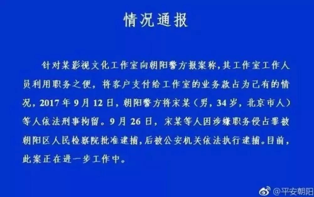 该通报称:某影视文化工作室报案称,2012年4月至2016年8月期间,总经理宋某等人利用职务之便,将客户支付给工作室的业务款占为己有,经警方依法受理,调查取证,于2017年9月12日将涉嫌职务侵占罪的宋某等人依法刑事拘留。