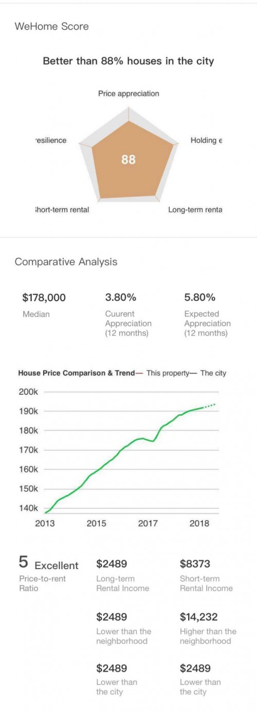 4、全面、及时、精确的数据库。WeHome实时监控全美4200万套房源,并实现4小时内同步最新市场动态。通过监测公开数据并与美国MLS、HouseCanary等专业数据机构合作,可获取包括消费形态、交易变化、经济波动等预测性数据。