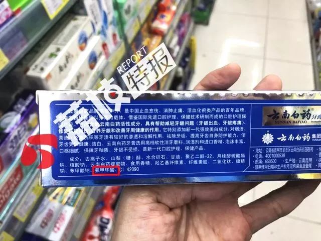 云南白药牙膏也并非所有产品都添加了这一成分,记者发现, 云南白药金口健牙膏和云南白药牙膏(朗健)产品中就没有“氨甲环酸”成分。