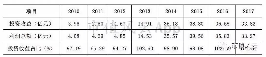 可以很清晰的看到,2010年至今,公司投资收益占利润总额的比重非常高,2016年、2017年投资收益占利润总额分别为102.09%、101.64%。