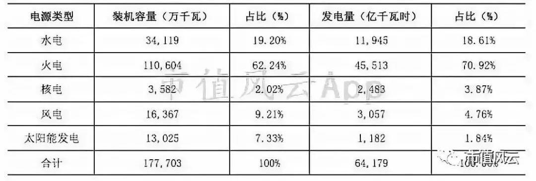 根据中国电力企业联合会《2017年全国电力工业统计快报一览表》,截至2017年12月31日,我国装机容量及发电量电源构成如下表所示: