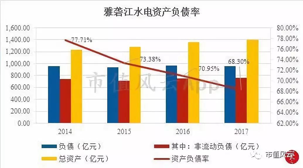 具体分析资产负债情况:截至2017年底,雅砻江水电总负债956.20亿元,其中长期负债759.23亿元,总资产1,399.95亿元。