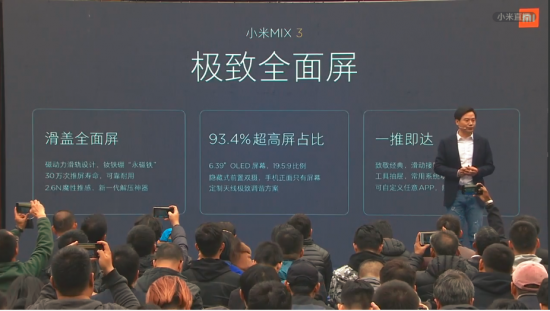 从发布会上公布的参数来看,小米MIX3屏占比大幅度提升,达93.4%,搭载骁龙845处理器。在大众较为注重的摄影功能上,采用和小米 8 同款 1200 万后置 AI 双摄模组,支持两倍光学变焦和四轴光学防抖,前置为 2400 万+200 万双摄,后置双1200万像素变焦双摄。高性能的配置以及磁动力滑盖全面屏设计让小米MIX3备受瞩目,成为小米扭转市场局势的一款重量级新机型。