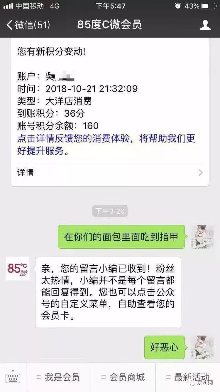 吴女士说,她两年前办了85度C会员卡,21日星期天晚上9点多来这家面包店,买了4块面包36元,其中一块小蛋糕当晚回家喂给小女儿吃掉了。第二天下午,吴女士自己拿出一块面包吃,但吃了一半,发现咬到嘴巴里的面包不对劲,吐出来竟发现是一截指甲!