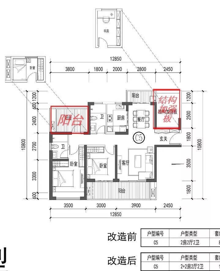 “相比开发商存在的其他问题,我们为何要揪着‘四房变两房’‘两房变一房’的问题不放呢?”业主代表赵黎明举例表达了他们的担忧:比如开发商规划报建的是“两房”户型,但事后要违规改造成“四房”户型,而“增加”的两个房间,即在结构加强板及阳台空间改造而成,“这样违规改造,既不安全,也不合法,执法部门要当违建拆除的。”
