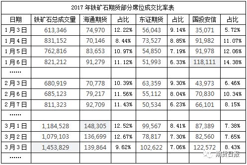 2017年一季度部分日期铁矿石成交量表:(注:海通、东证席位基本为高频成交量)