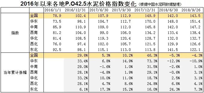 华北、西北地区水泥价格维持稳定上涨,但涨幅仍逊于华东、中南、西南三区。2018年前三季度水泥价格整体保持平稳。