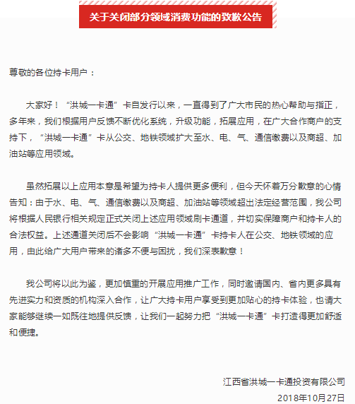 对此,洪城一卡通经由微信公众号发表致歉公告,承认其在水、电、气、通信缴费以及商超、加油站等领域超出法定经营范围。该公司称将更加慎重的开展应用推广工作,同时邀请国内、省内更多具有先进实力和资质的机构深入合作。