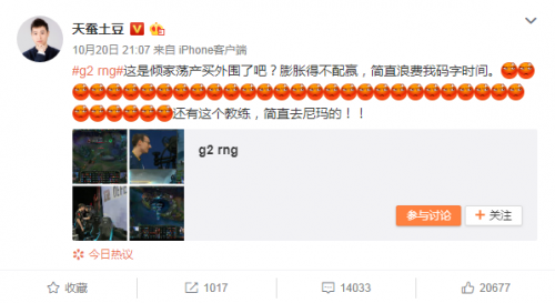 上周,S8小组赛中夺冠热门队RNG2:3输给了G2队,知名网络作家天蚕土豆在微博大骂。