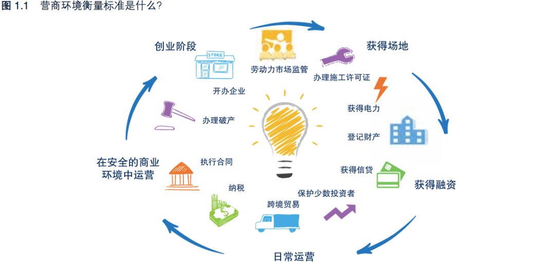 世界银行《营商环境报告》的衡量指标很多,包括开办企业、办理施工许可证、获得电力、登记财产、获得信贷、保护少数投资者、纳税、跨境贸易、执行合同和办理破产的过程。