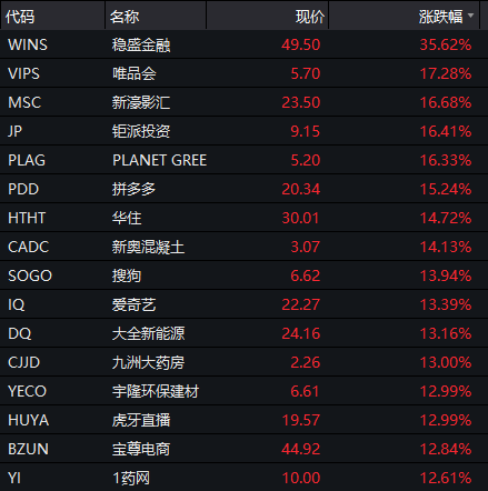 唯品会隔夜大涨17.28%;拼多多涨15.24%;搜狗、爱奇艺、虎牙直播涨幅均逾12%;阿里巴巴、百度等涨幅在6%附近。