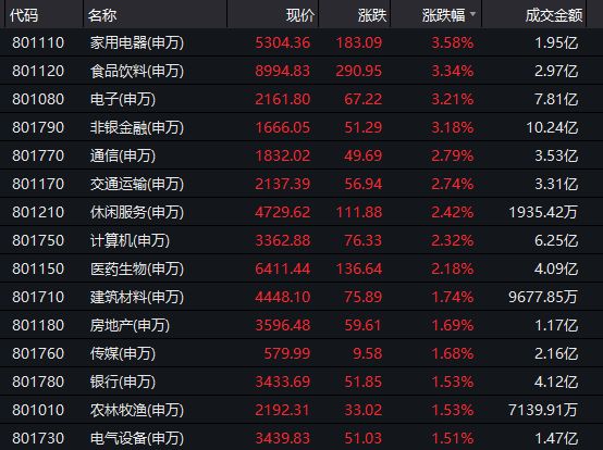 28个申万行业指数开盘悉数飘红,其中家用电器、食品饮料、电子和非银金融行业指数领涨,涨幅均逾3%。