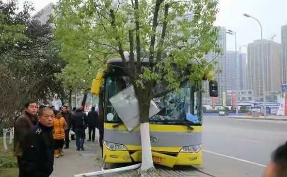 司机一个趔趄,公交车撞上行道树,车头受损,汽车骤停。乘客也有不同程度撞伤。