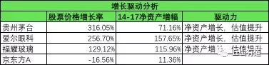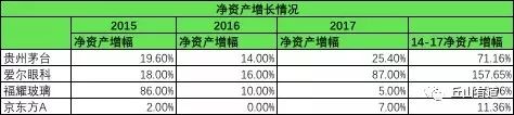 无论是贵州茅台,爱尔眼科还是福耀玻璃,14-17年间,净资产都有较大的增长,增长率较高的是爱尔眼科,最低的是贵州茅台;