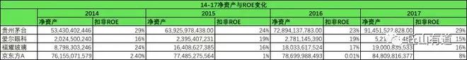 除京东方外,其他企业的ROE都能维持在一个固定的高度,在小区间内上下波动,如,贵州茅台在2014年的ROE为29%,2015、2016年下降到24%左右,2017年又回升至29%。