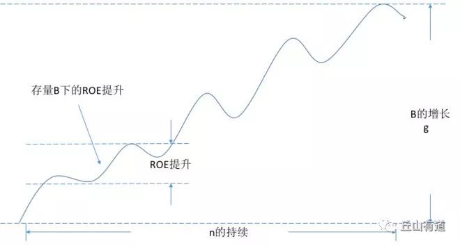 如果用相对形象的图来表示,净资产的增长空间,ROE的高度和持续时间以及它们如何影响企业的价值。