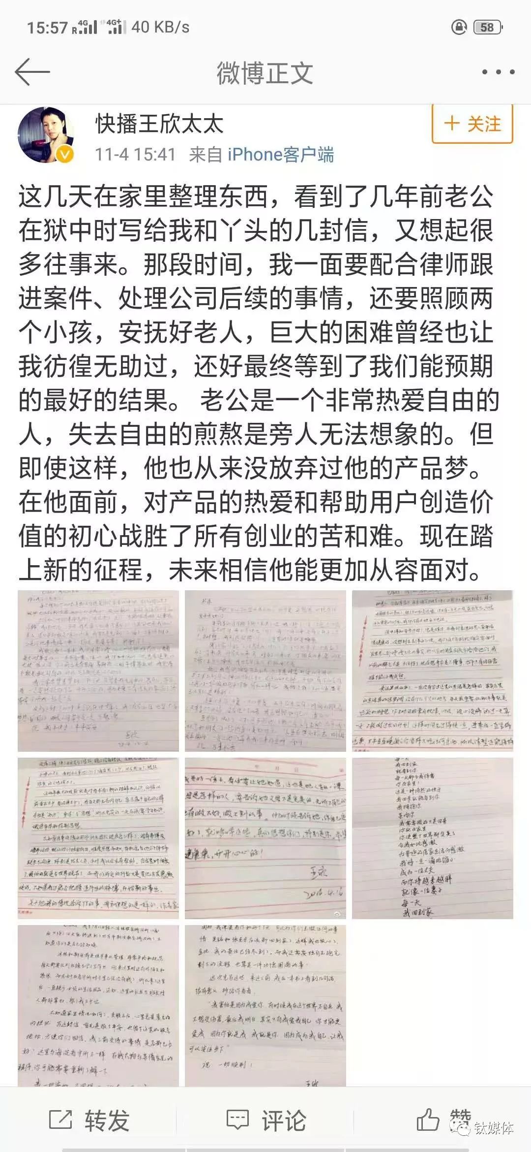 11月4日下午,微博署名为“快播王欣太太”(妻子彭鹏)通过微博公开了与狱中王欣沟通的部分信件。