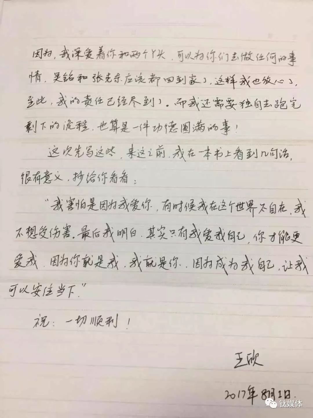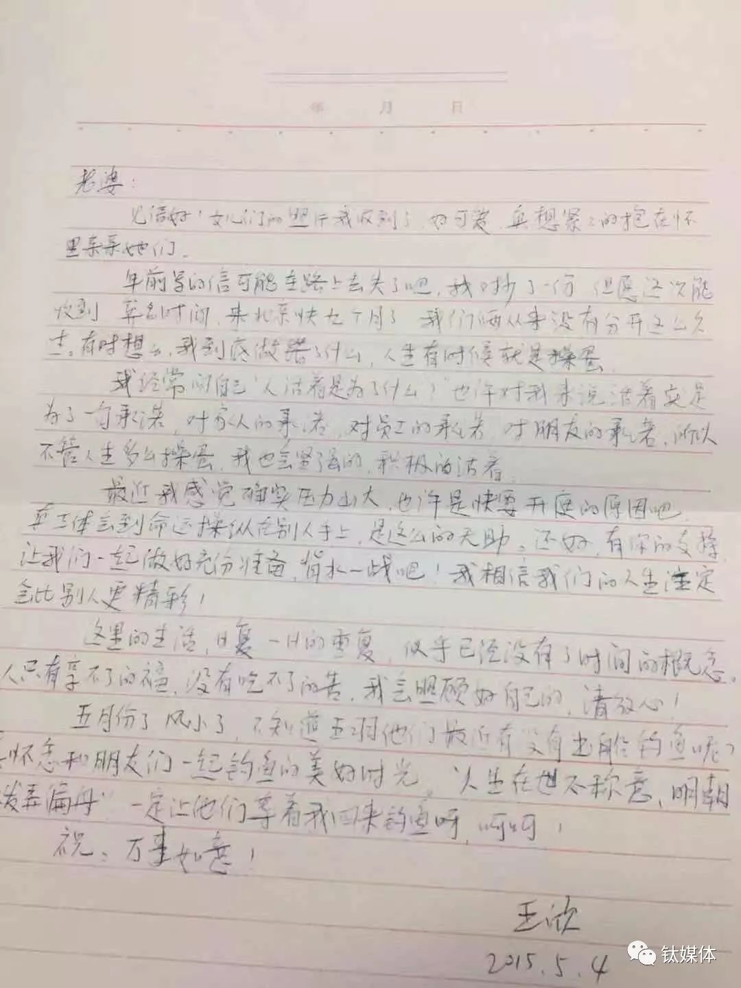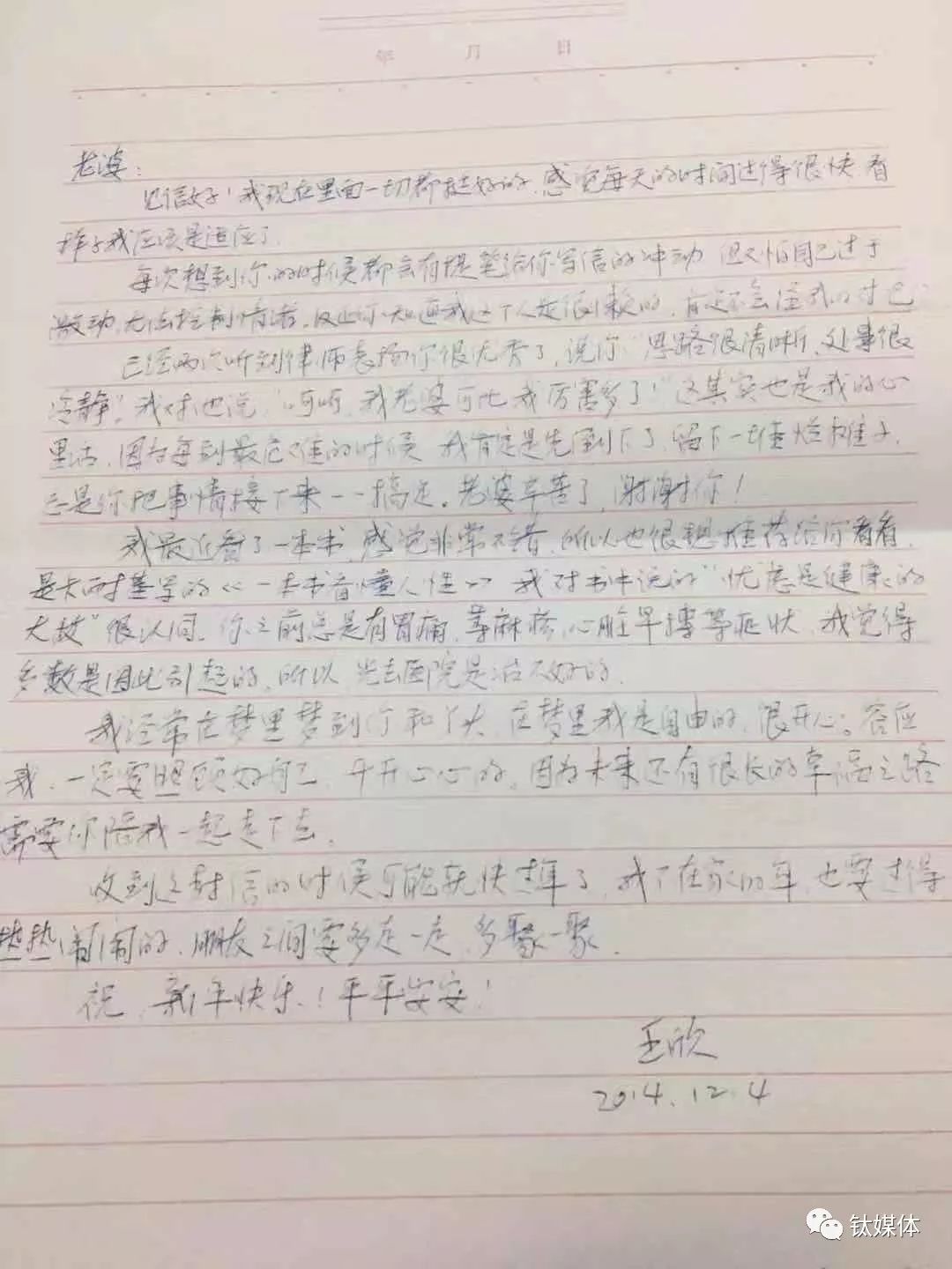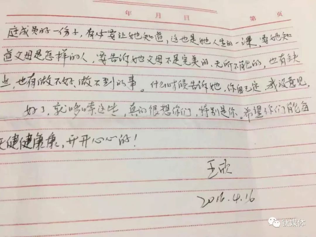 2016年4月王欣写给妻子的信件