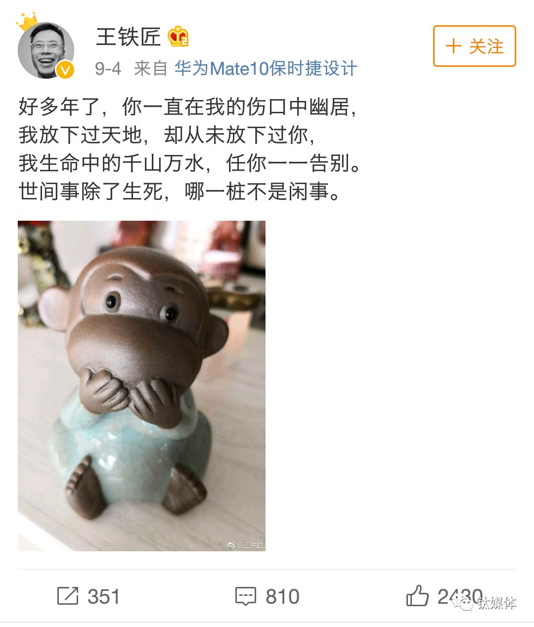9月4日王欣发了一篇微博,引用仓央嘉措的情诗,暗示从此告别快播。“好多年了,你一直在我的伤口中幽居,我放下过天地,却从未放下过你,我生命中的千山万水,任你一一告别。世间事除了生死,哪一桩不是闲事。”
