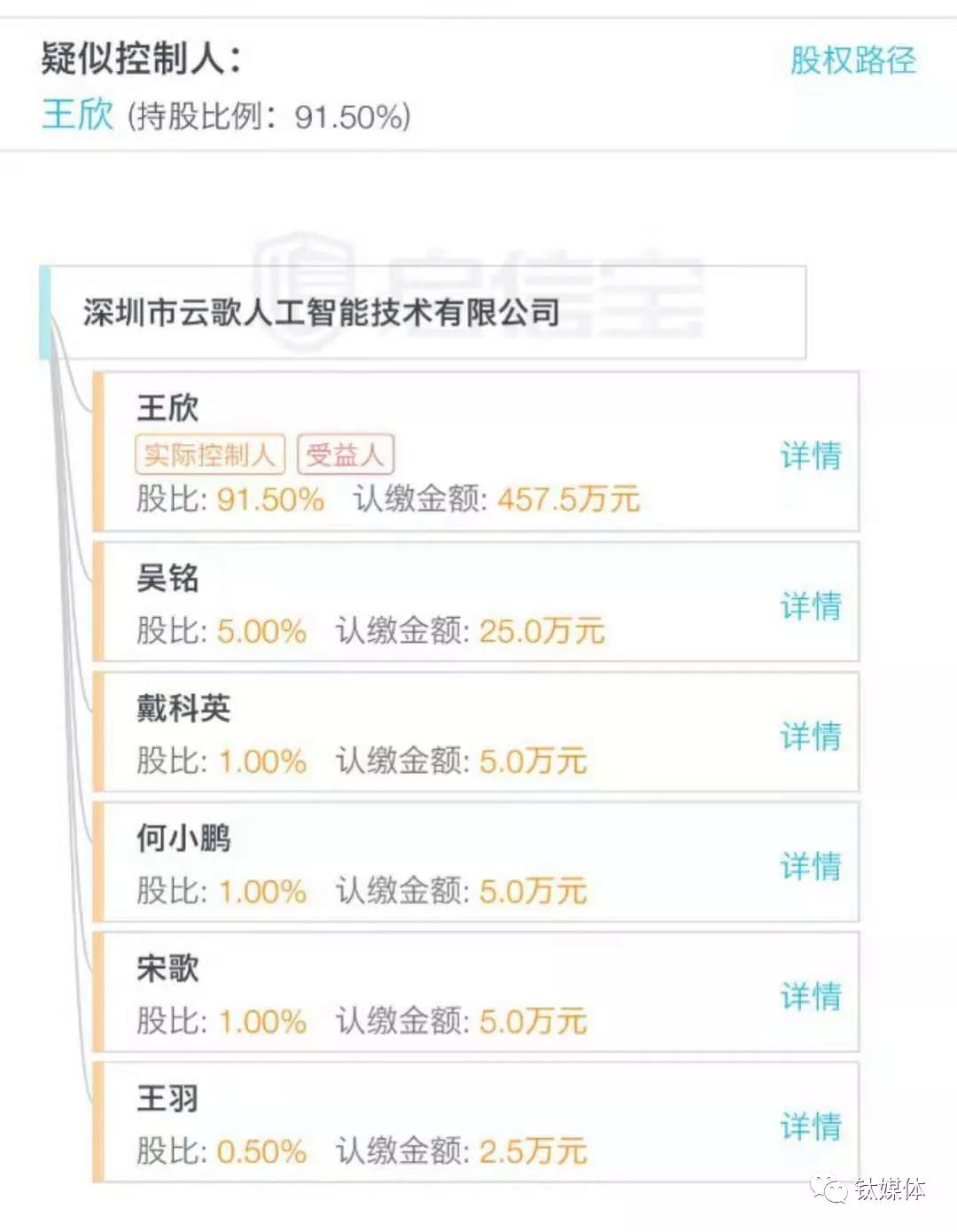 云歌人工智能公司的股权架构/图片来源启信宝