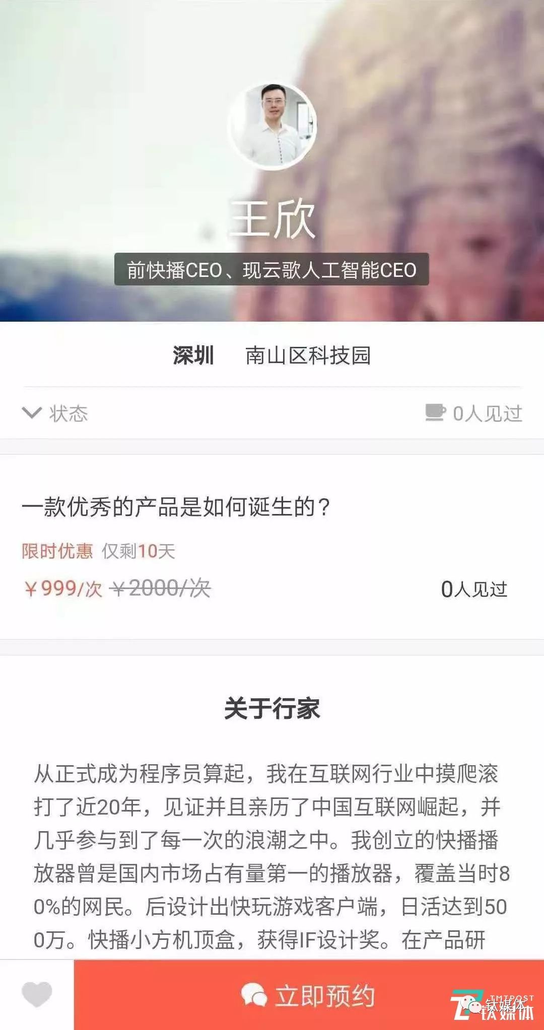 新的事情远未结束,近日快播创始人王欣入驻知识问答平台“在行”,他开设的《一款优秀的产品是如何诞生的?》的面授课程为999元/次,用户付费可以与其约见。据该平台上的资料介绍,他将分享他最近几年关于产品与技术的思考等相关话题。