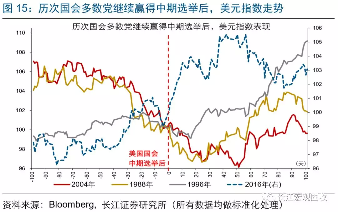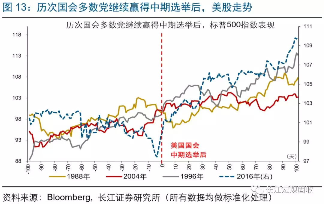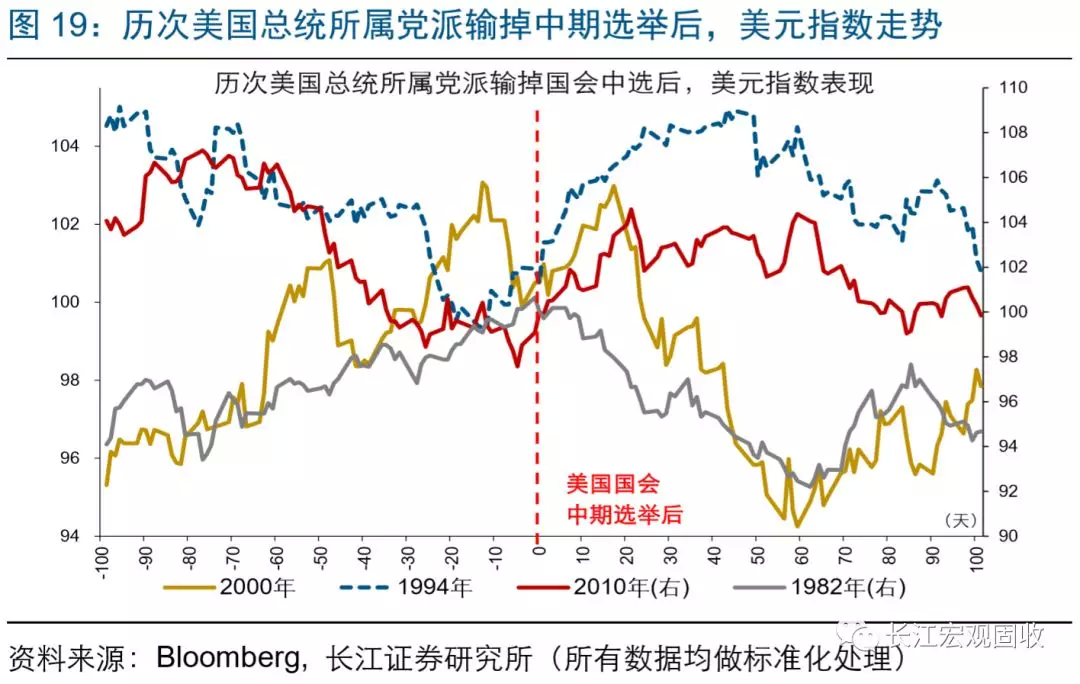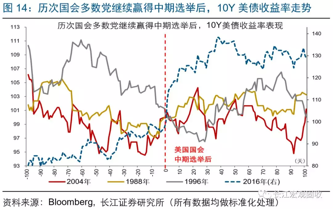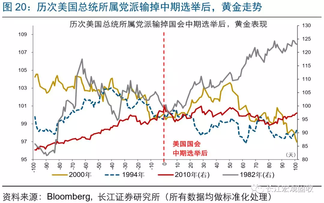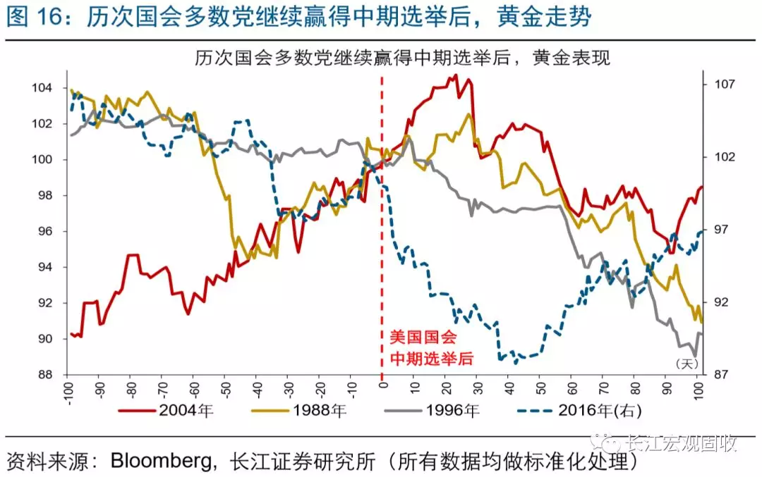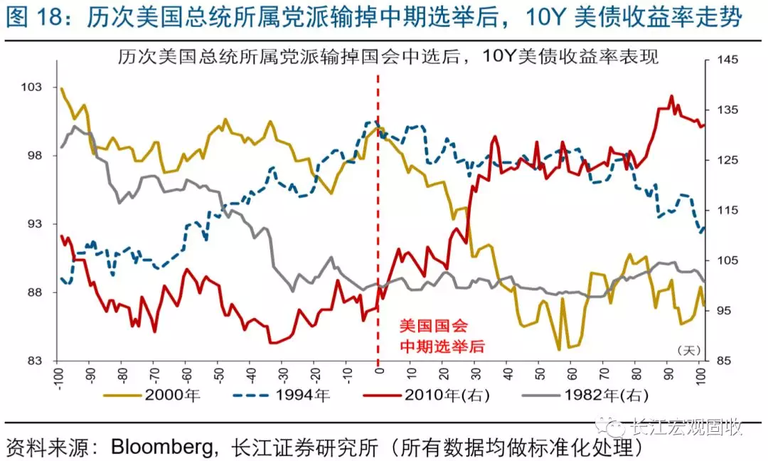 若共和党在国会中期选举后失去对国会的控制,短期内市场风险偏好或受打压,美股和10Y美债收益率趋于回落,黄金趋于走强。由于共和党和民主党在诸多议题上分歧较大,一旦美国总统所属党派无法控制国会,总统的众多政策主张均有可能遭遇国会阻击,政策路径预期因此趋于混乱。回溯历史,历次总统所属党派输掉国会中选后(包括在1院及2院同时失利情况),短期内市场风险偏好均有所回落,美股趋于下跌,10Y美债收益率趋于下行(2010年因QE1结束的干扰,10Y美债收益率上行),黄金趋于走强。