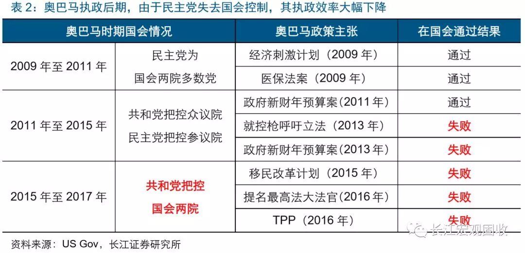 国会选举对特朗普至关重要,若共和党失去多数党地位,特朗普执政效率或大幅下降。由于美国国会拥有各类议案审批、关键人事提名审批以及弹劾总统等权力,国会选举对在任总统至关重要。奥巴马执政时期,正是因为民主党从2011年起失去众议院控制,奥巴马的众多政策主张和人事提名均无法落地、执政效率大幅下滑。对于特朗普而言,此次国会选举也意义重大。2017年至2018年,在国会共和党的大力支持下,他成功推行了减税政策,并任命了2位最高法院大法官。一旦在剩余2年任期内无法获得国会支持,特朗普诸多政策主张及相关人事提名或难落地,并可能影响他2020年总统大选。