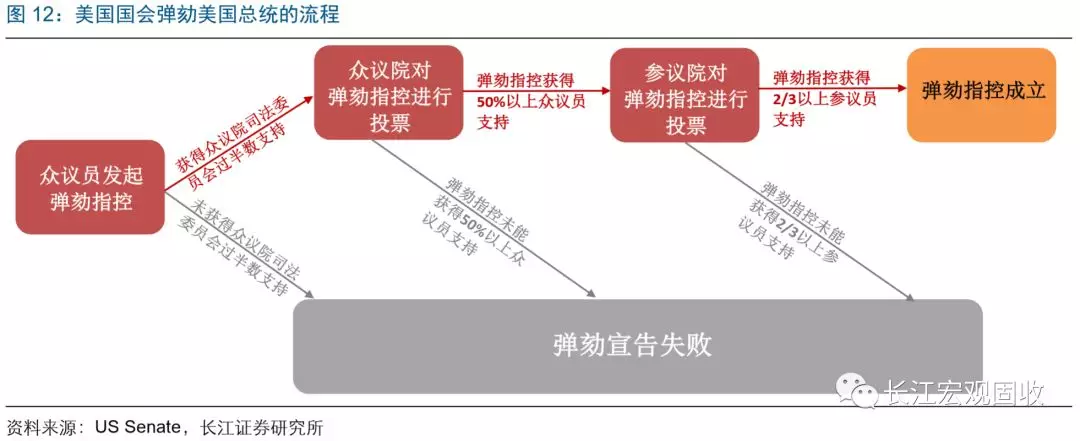若民主党赢得国会众议院选举,特朗普有被弹劾风险,但较难被成功弹劾。根据美国宪法条例,如果美国总统涉嫌“叛国、贿赂或其他重罪和轻罪”,国会有权对其发起弹劾指控;若1/2以上的众议员和2/3以上的参议员均支持弹劾,那么针对总统的弹劾指控随之成立,总统将被判罪、免职。2018年以来,随着特殊检查官对特朗普“涉俄门”正式发起调查,民主党多位议员均表示考虑弹劾特朗普。此次国会中期选举中,若民主党赢得众议院选举,它将获得弹劾特朗普的权力。然而,由于共和党在参议院中拥有至少42位参议员,只要共和党始终支持特朗普,特朗普被成功弹劾的概率几乎为0。
