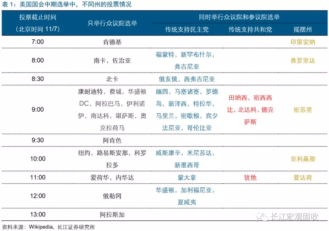 2018年国会中期选举将于11月6日举行,选举结果公布时间由具体投票进程决定。11月6日,美国将举行国会中期选举,各州投票开始时间按不同时区陆续开放。此次国会选举中,众议院全部席位和参议院35席需重新选举;参议院中,共和党和民主党分别有9席和26席进行换选。由于美国选民可在注册期限内申请缺席选票(通过邮寄选票、非现场方式投票),叠加各州申请缺席选票的截至日期不同,因此此次国会选举结果有可能在当天公布,也有可能在11月6日后的几天内公布。