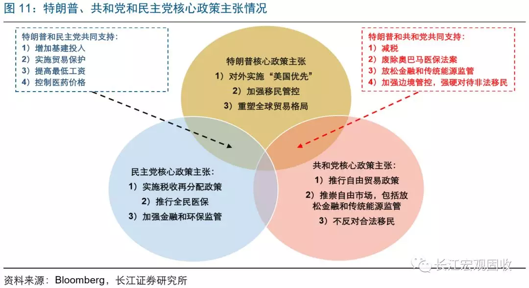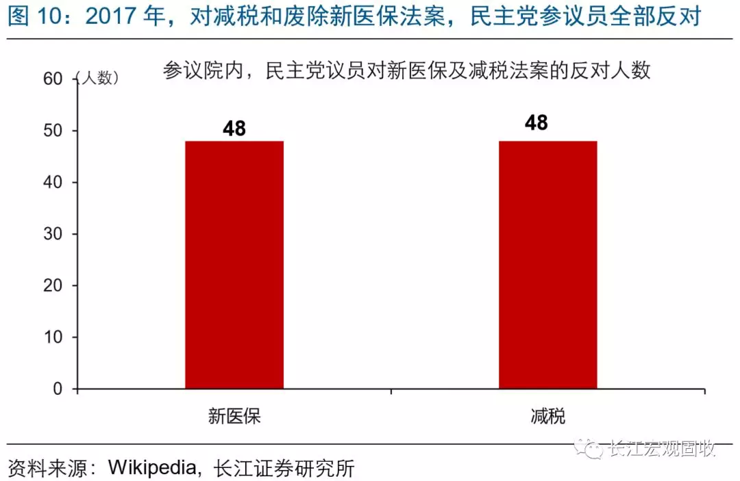 此次国会选举,或将显著影响特朗普不同政策未来推行进程。从特朗普、共和党和民主党核心政策主张来看,特朗普和共和党均支持减税、放松金融监管和废除奥巴马医保法案等,特朗普与民主党均支持增加基建投资和实施贸易保护等。此次国会选举中,若民主党赢得众议院、共和党赢得参议院,特朗普预计将继续实施贸易保护,但在放松金融监管和废除奥巴马医保上或将遭遇民主党阻击;若共和党在两院均获胜,特朗普预计将与共和党合作,加快推动二次减税、放松金融监管和废除新医保法案等落地。此外,在扩大基建投资上,由于民主党支持、共和党反对,特朗普若无法同时获得两党大部分议员支持,将很难推动基建政策落地。