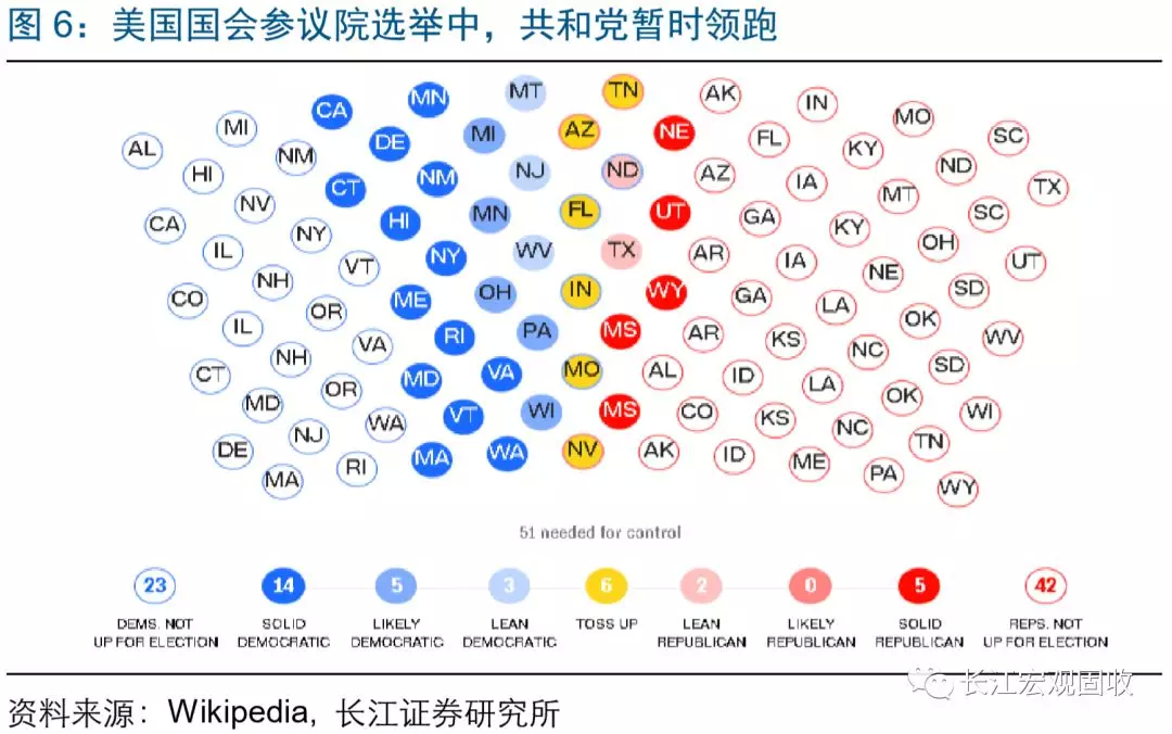 最新民调数据显示,民主党暂时领跑众议院选举,共和党在参议院中继续保有一定优势。历史经验显示,国会中期选举存在“民意回摆”现象,往往对现任总统所属的政党更为不利。例如,上任总统奥巴马当选2年后,共和党便通过中期选举赢得众议院多数党地位。从最新民调数据来看,此次国会众议院选举中,共和党和民主党较为安全的席位分别为199席和206席,其余30席为摇摆州席位;参议院选举中,共和党和民主党较为安全的席位分别为49席和45席,剩余6席为摇摆州席位。综合来看,民主党暂时领跑众议院选举,而共和党在参议院中继续保有一定优势。