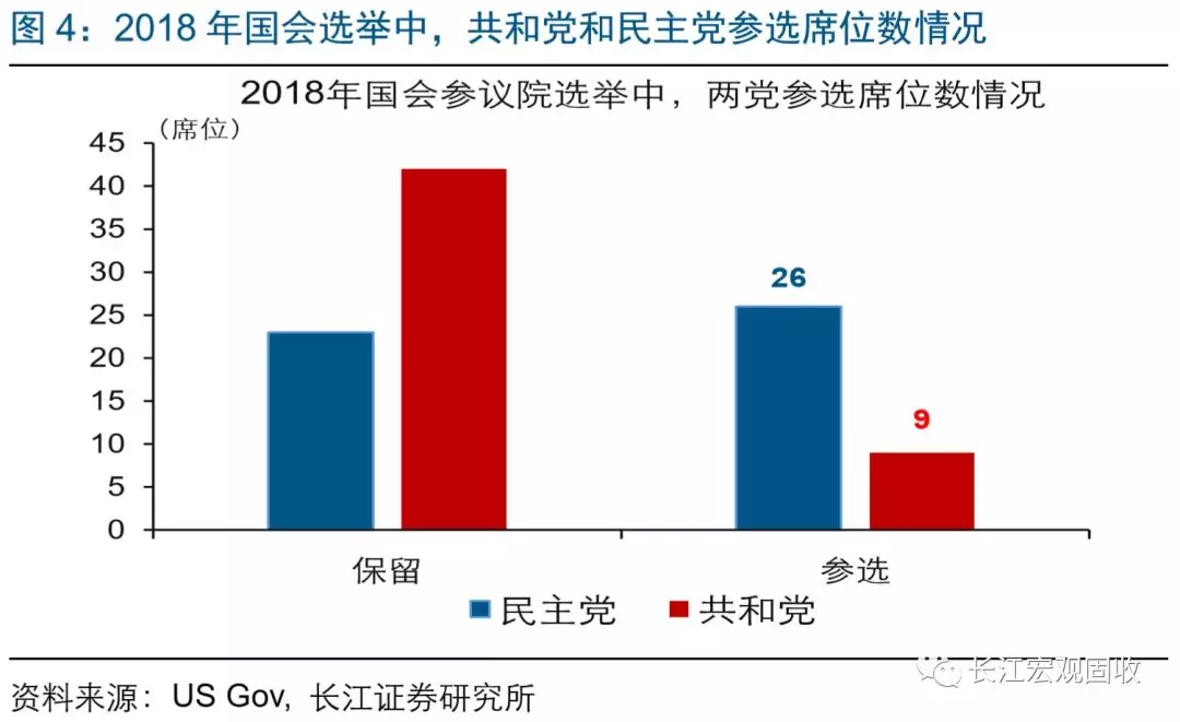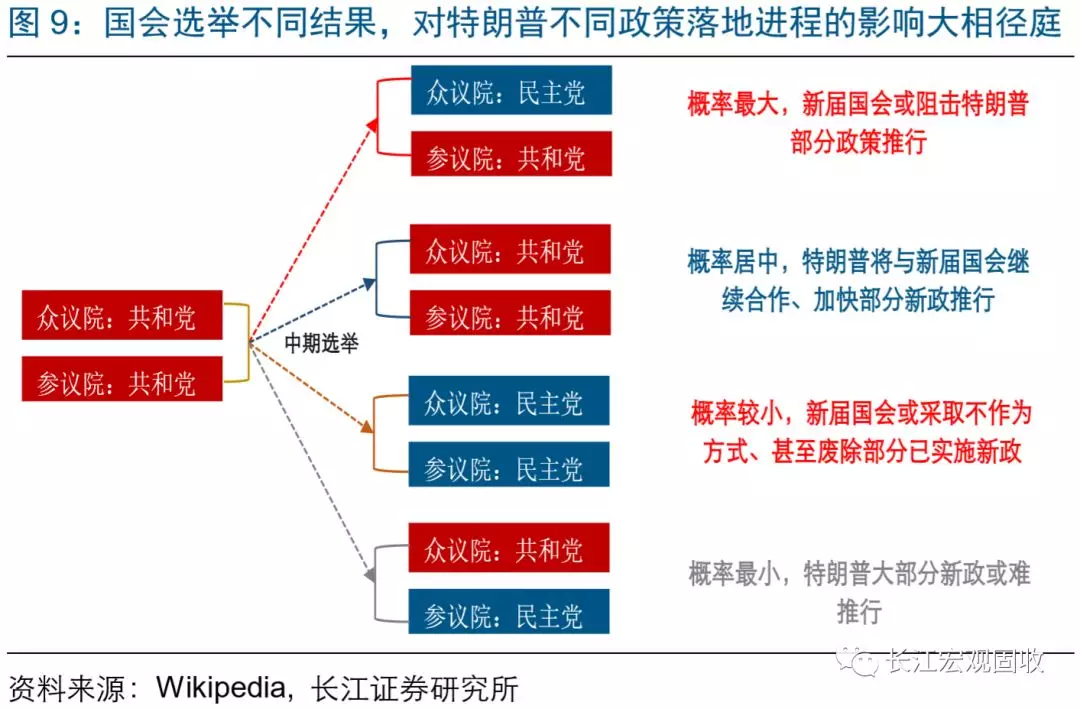 若共和党赢得中期选举,特朗普或将加快推行二次减税、放松金融监管和废除奥巴马医保等;反之,特朗普或只能维持现有政策格局。特朗普和共和党均支持减税、放松金融监管和废除奥巴马医保法案等,特朗普与民主党均支持增加基建投资和实施贸易保护等。国会选举不同结果,使特朗普不同政策的推行存异。同时,由于共和党反对扩大基建投资,仅获民主党支持或较难让基建落地。