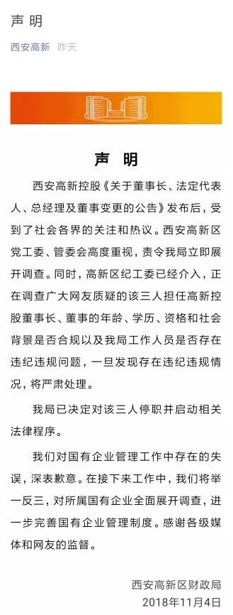但11月4日下午,西安高新区财政局再次发声,表示高新区纪工委已经介入调查,并决定对三人停职并启动法律程序。