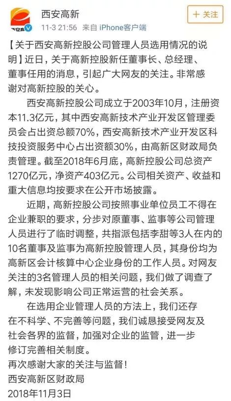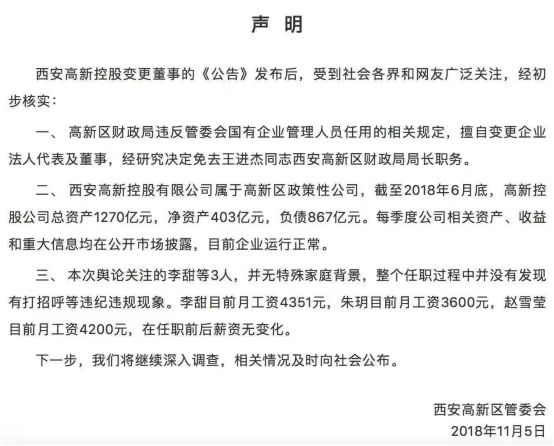 今天,“西安千亿国企,85后任董事长”的新闻持续发酵。凌晨,西安高新区管委会通过官微发表声明称,高新区财政局违反管委会国有企业管理人员人用的相关规定,擅自变更企业法人代表及董事,决定免去现任财政局局长职务。