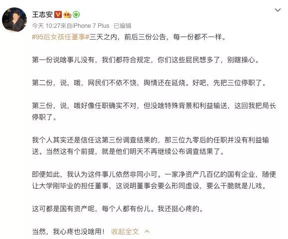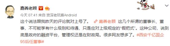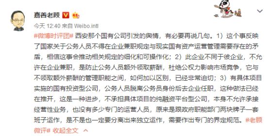 嘉善老顾今日就此事再次发变了微博,博文表示,此事这个事反映了国家关于公务人员不得在企业兼职规定与现实国有资产运营管理需要存在的矛盾。