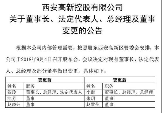 这件事,还要从一份公告开始说起。9月14日,西安高新控股有限公司发布《关于董事长、法定代表人、总经理及董事变更的公告》称:根据本公司内部管理需要,按照股东西安高新区管委会安排,本公司于2018年9月4日召开股东会,会议决定对现有董事长、法定代表人、总经理及部分董事做出变更,具体如下: