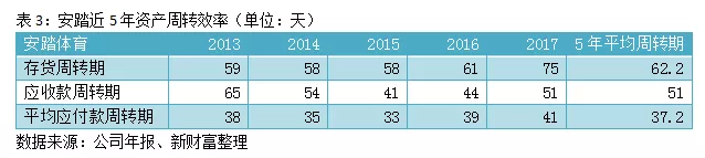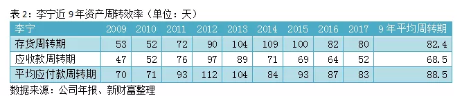 不难看出,李宁的运营效率不高,甚至略低于行业平均水平,其近9年的存货平均周转期为82.4天,应收款平均周转期为68.5天;再把时间拉进一点,李宁近5年的存货周转和应收账款平均为95、69天。而安踏、特步、361度近5年的存货平均周转期分别为62.2、66.8、75.8天(表3、表4、表5)。
