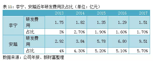 目前,李宁在研发上的支出非常微薄,而且呈现下降的趋势,2013年的研发费用占比为3%,到了2017年只有1.51亿元,在营收中占比仅为1.7%。相反,安踏这一块的投入更高,2017年研发费用达到9.51亿元,占比5.7%(表11)。而耐克2017年研发费用达到33亿美元,研发费用占比达到9%。